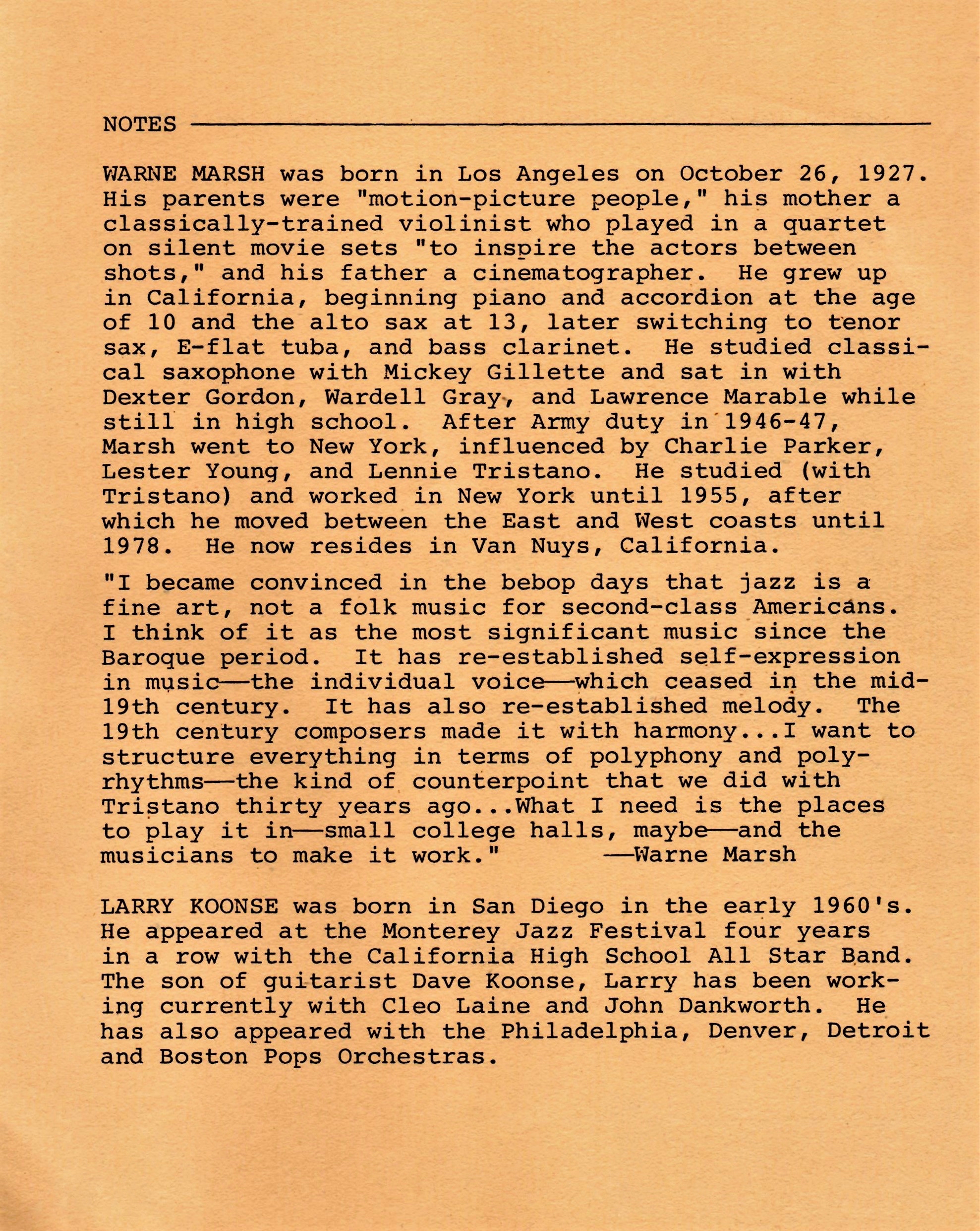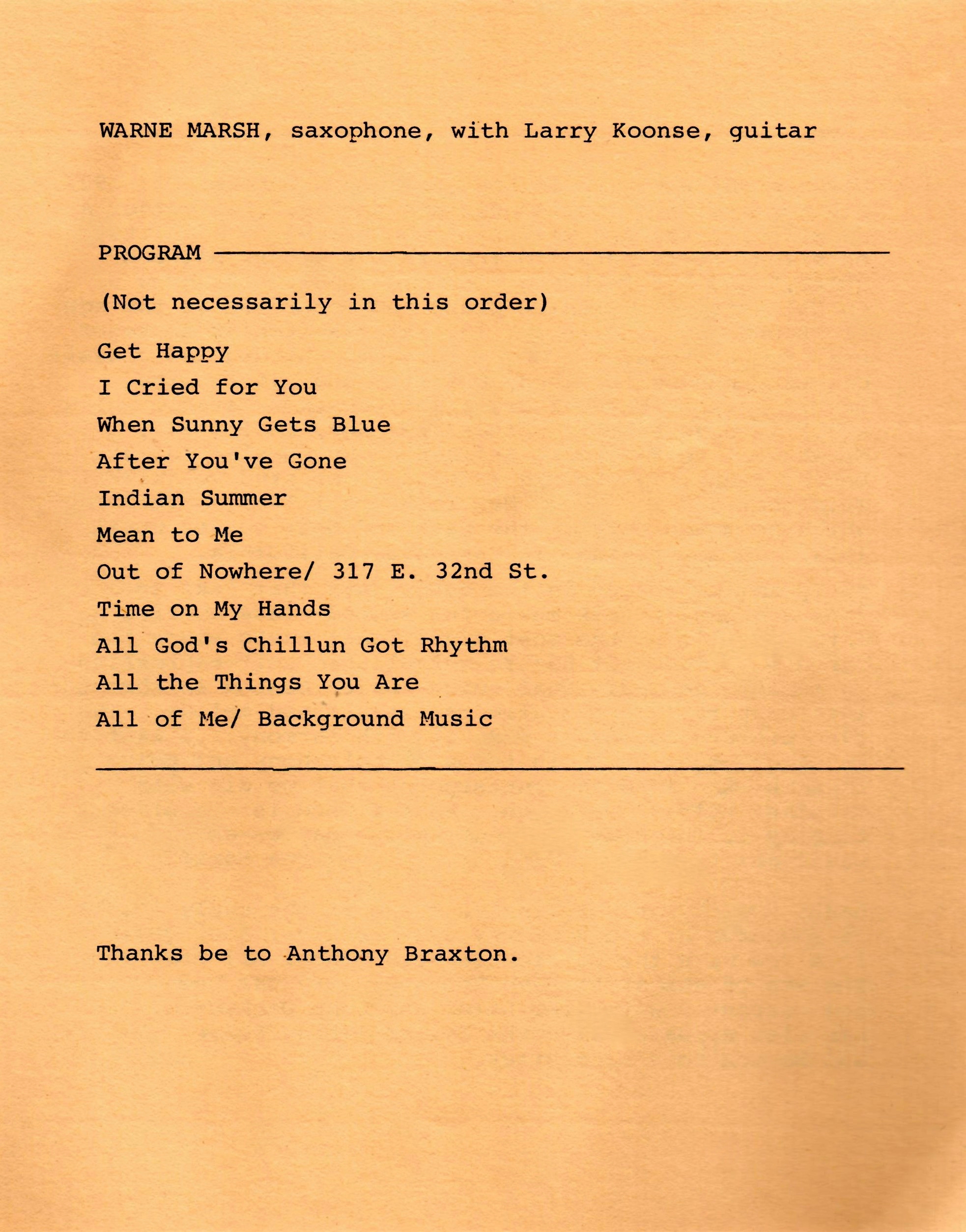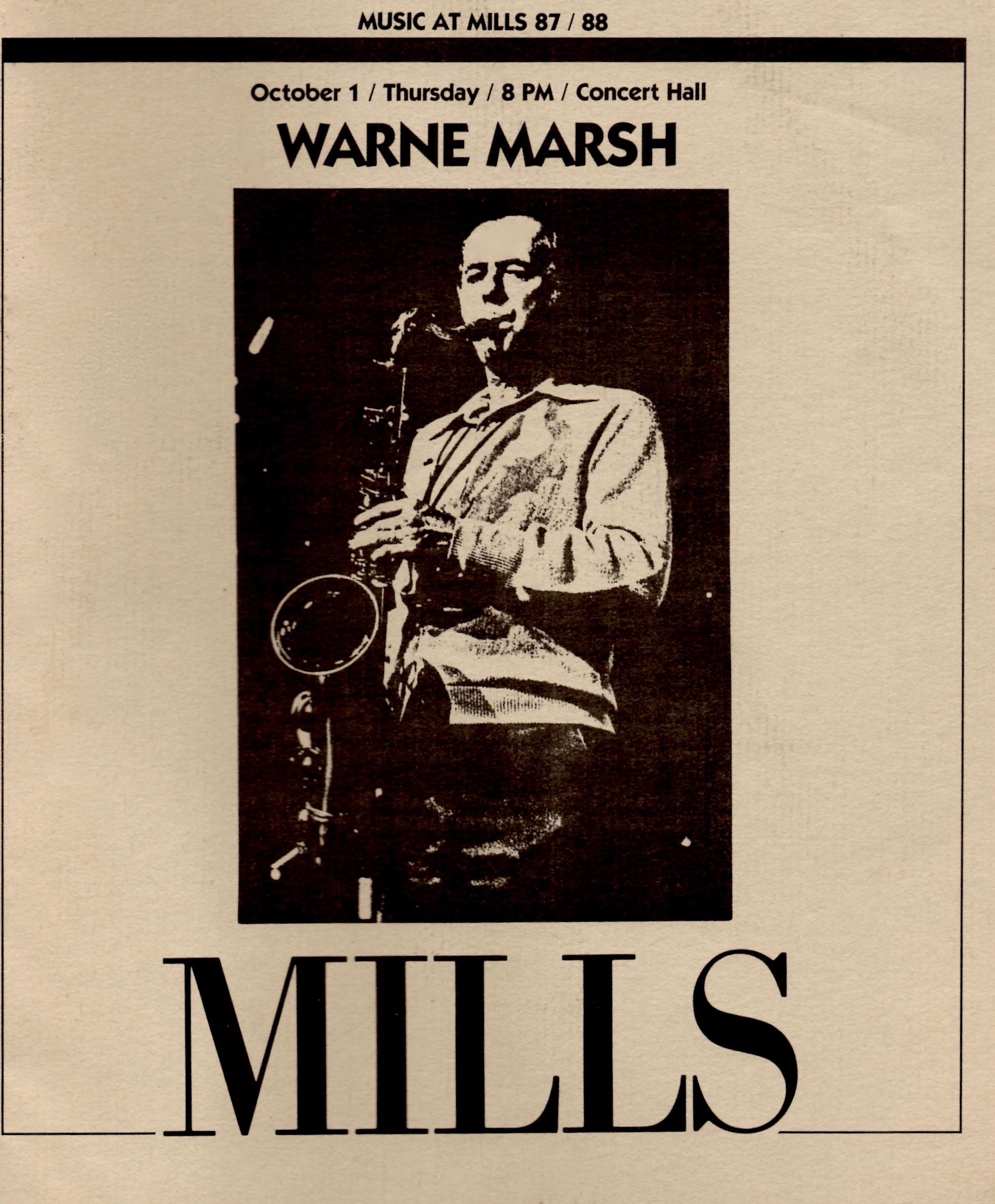 Original Warne Marsh concert program from Mills College Oct.1,1987.