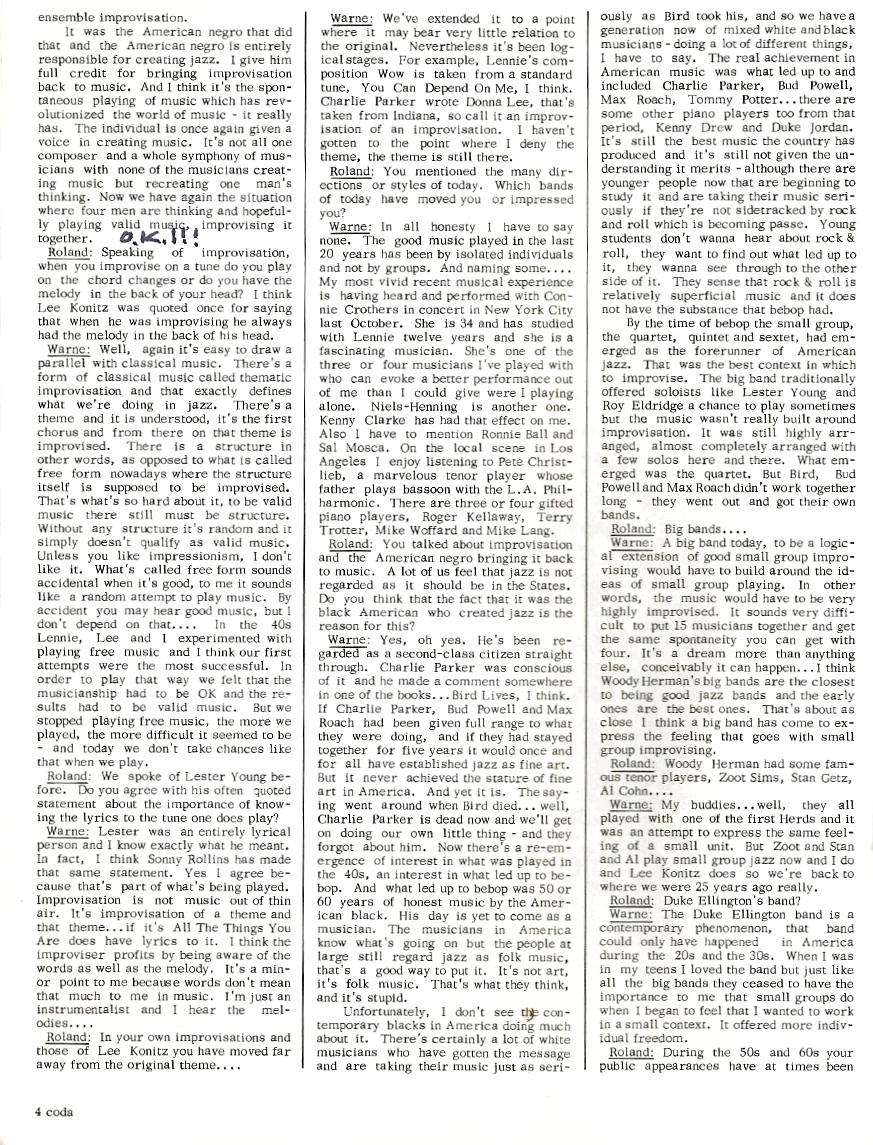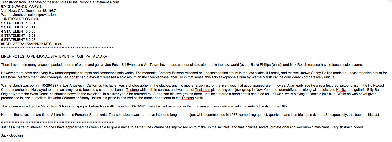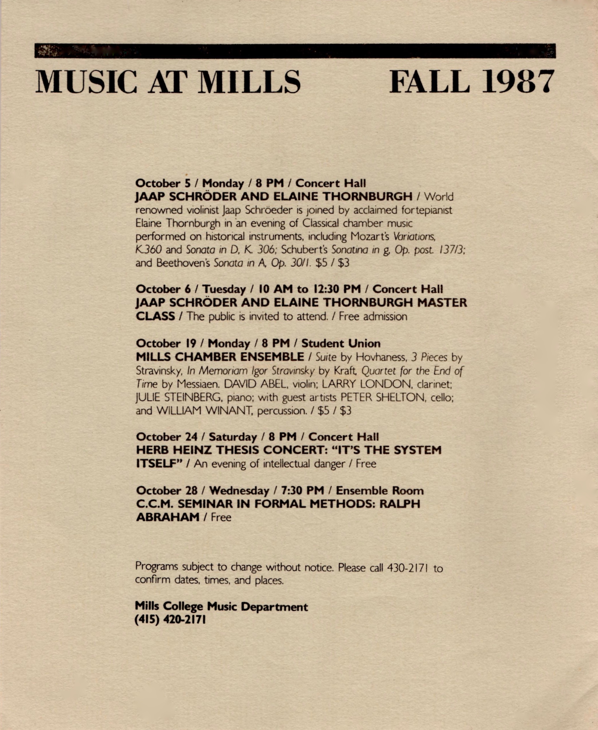 Original Warne Marsh concert program from Mills College Oct.1,1987.
